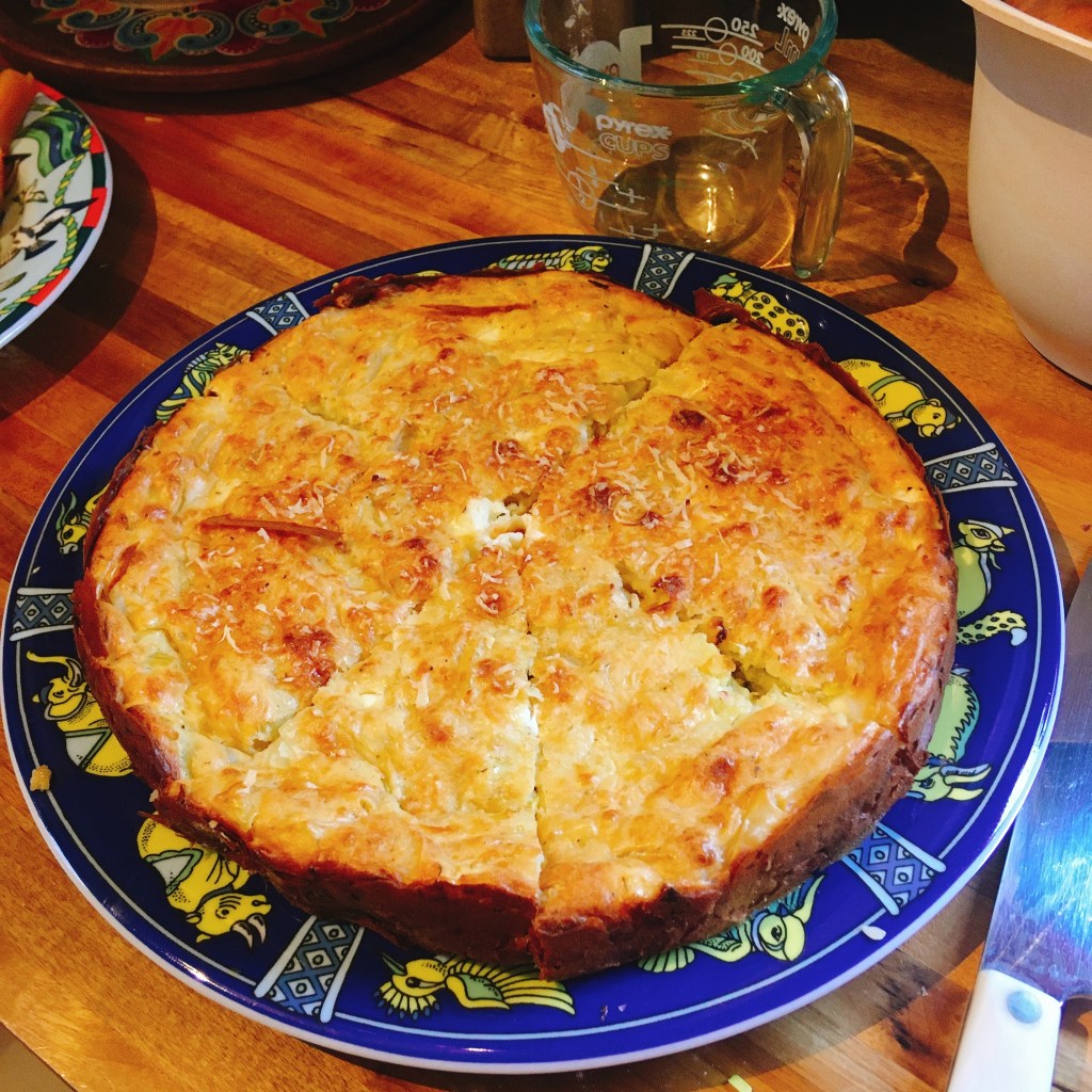I am currently cooking from “The Greek Cook” by Rena Salaman. I got it from the library before they closed up. It’s divided up by seasons and it looks like I will get though 3 seasons before they open back up. Tonight I made “Elektra’s Cheese and Leek Pie”, which was freaking delicious and really easy to make.